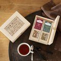 Ab 50 Stück mit Deinem Branddruck auf dem Deckel der Birkenholzbox: Ein Geschenk liebevoll und nachhaltig zu verpacken, bereitet Dir Freude. Deshalb lassen wir unsere Premium Präsentboxen in einem Familienbetrieb von Hand fertigen und Dein Logo in den Deckel einbrennen. So entsteht ein Premium Präsent mit Langzeit-Werbeeffekt. Wähle aus folgenden Tee-Spezialitäten: Schwarzer Tee Darjeeling, Grüner Tee Japan Bancha, Kräutertee Almwiese oder Chai Gewürzmischung. Suchst Du eine andere Größe? Dieses Premium Präsent ist auch mit 3, 4 oder 8 Snacks erhältlich.